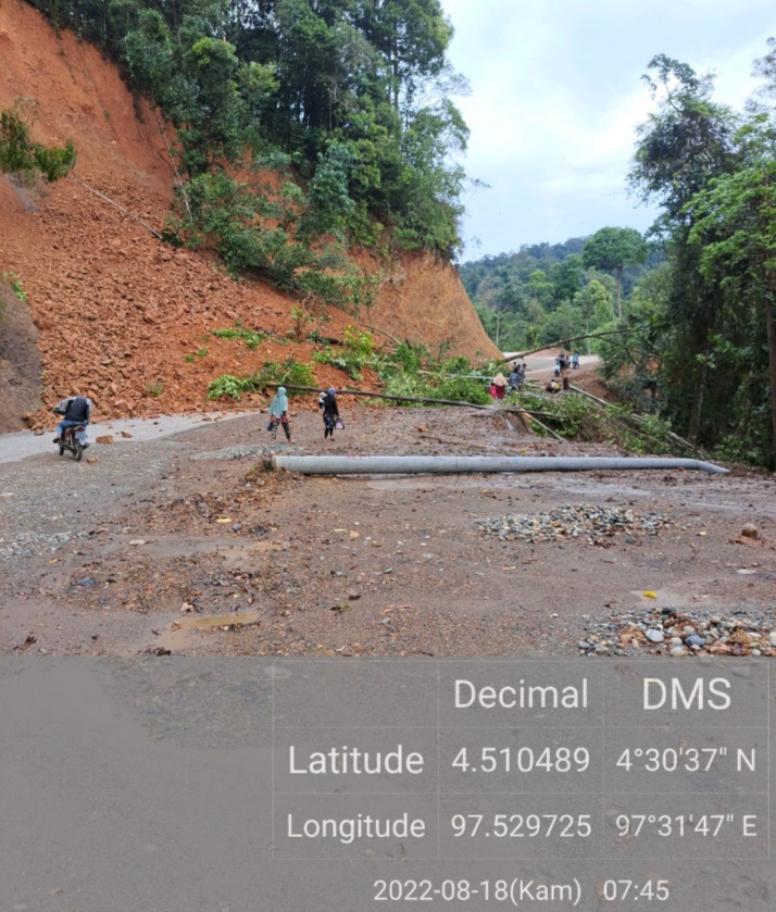 ACEH TIMUR | Terjadinya longsor di Bukit Mancang, Jalan Perlak Lokop, Desa Bunin, Kec. Serbajadi, Kab. Aceh Timur, hingga menutupi Jalan Perlak Lokop dan menimpa Tiang Listrik ,sehingga di Serbajadi listrik padam lebih dari sehari. Kamis,( 18/8/2022).