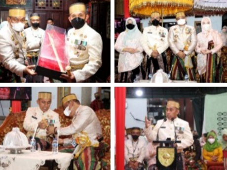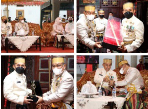 MAKASSAR | Duplikasi benda-benda pusaka Kerajaan Bone berupa Kelewang La Tea Riduni, Keris La Makkawa, Teddung Pulaweng, Teddung Salaka, Selempang Emas Raja, Songkok Recca, Bosara Besar, Bosara Kecil, Baki dan Tempat Gelas Gellang, peninggalan Raja diserahkan dari Bupati Bone Dr. H. Andi Fahsar Mandi Padjalangi, M.Si., kepada anak cucu Raja Bone Andi Mappanyukki yaitu Mayjen TNI Andi Muhammad, S.H., Pangdam XIV/Hasanuddin bertempat di rumah adat Kerajaan Jl. Kumala Makassar, Rabu (16/03/2022).