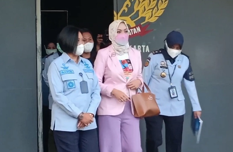 Terlihat perempuan kelahiran 1977 itu mengenakan baju kaos putih dan blazer berwarna pink. Dia juga menenteng tas berwarna coklat.