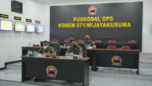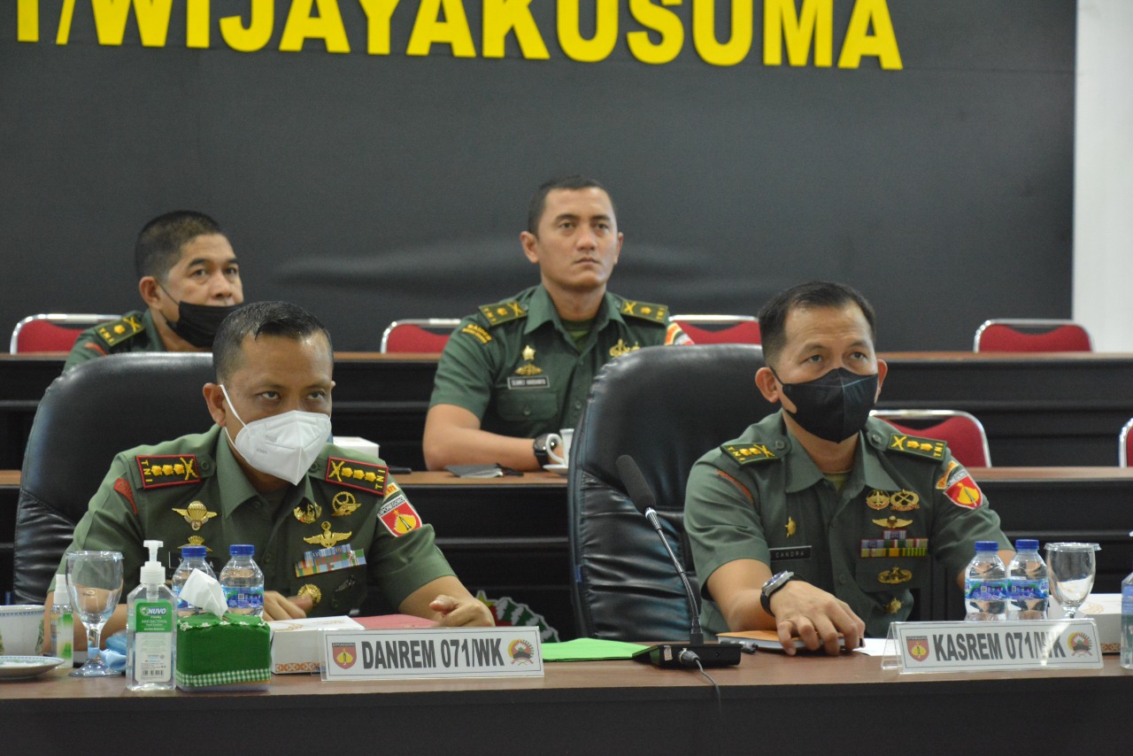 BANYUMAS | Untuk mengantisipasi melonjaknya kasus Penyakit Mulut dan Kuku (PMK) di wilayah Jawa Tengah, Danrem 071/Wijayakusuma Kolonel Inf Yudha Airlangga, S.E., ikuti Video Conference yang diselenggarakan oleh Pemerintah Provinsi Jawa Tengah dan Kodam IV/Diponegoro, Rabu (13/7/2022) di Ruang Puskodal Ops Makorem 071/Wijayakusuma, Sokaraja, Banyumas.