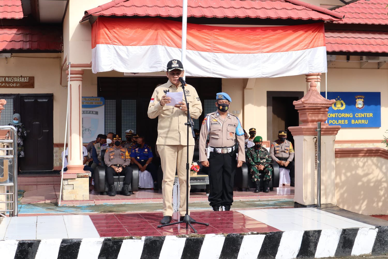 BARRU | Bupati Barru Ir. H. Suardi Saleh, M.Si memimpin apel gelar pasukan Operasi Ketupat 2022 yang berlangsung di halaman Polres Barru pada Jumat 22 April 2022.