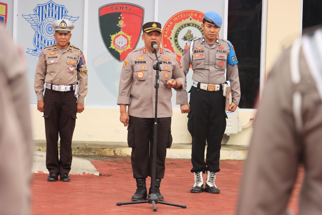 BARRU | Kepala Kepolisian Resor (Kapolres) Barru AKBP Dodik Susianto, S.I.K memimpin apel pagi di halaman Mako Polres Barru, pada Selasa (10/1/2023).