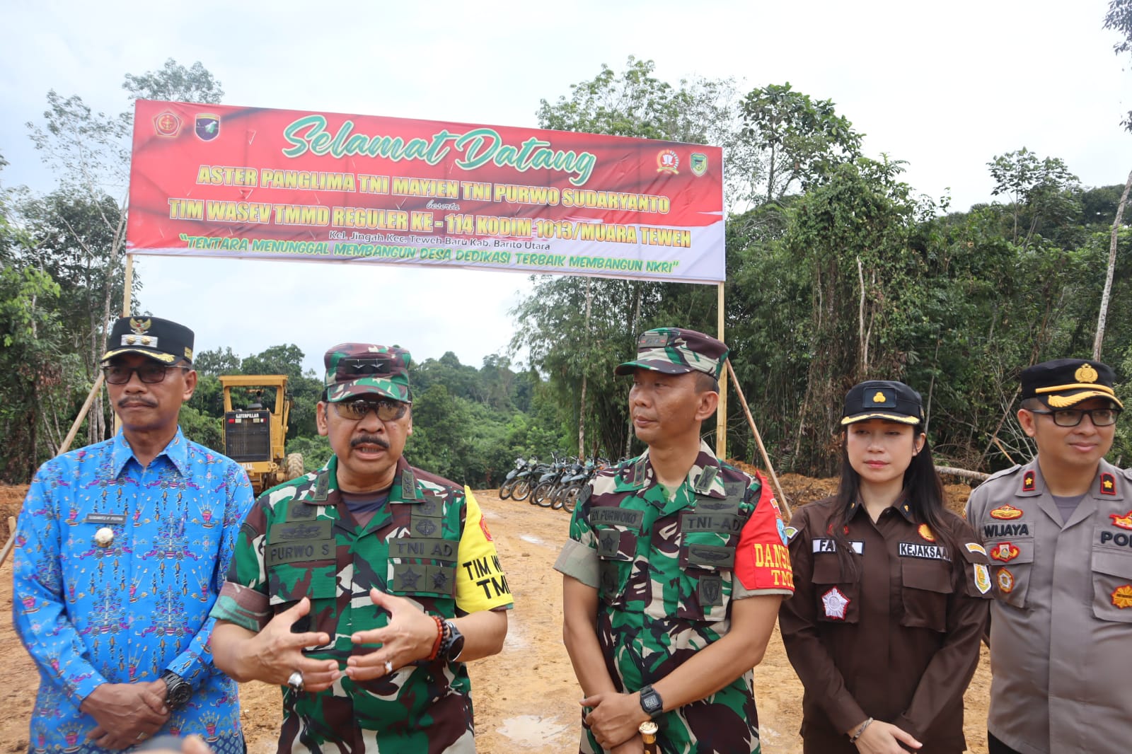 Hal ini disampaikannya Aster Panglima TNI Mayjen TNI Purwo Sudaryanto didampingi Kasi Pers Korem 102/Pjg Kolonel Czi Dedy Mulyadi, Pabandya Ster TNI Letkol Inf O.Sahrojat, Wakil Bupati Barito Utara Sugianto Panala Putra, SH, Sekda Barito Utara Drs. Muhlisasi, Dansatgas TMMD Dandim 1013/Mtw Letkol Inf. Edi Purwoko, Wakapolres Barito Utara Kompol. Roni Wijaya, S.I.K, Ketua Pengadilan Negeri Muara Teweh Diwakili Kasubag Umum dan Keuangan Pengadilan Negeri Muara Suparto, SE, Kepala Kejaksaan Negeri Barito Utara Diwakili Kasi Datun Kejaksaan Negeri Barito Fany, SH, Ketua Pengadilan Agama Muara Teweh Diwakili Panitra Pengadilan Agama Muara Teweh M. Nor Kifli, SHI, Pasi Teritorial Kodim 1013/Mtw Lettu Inf. M. Saroni, dan Pasi Ops Kodim 1013/Mtw Kapten Inf. Trio Pramono.