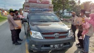 PASANGKAYU | Jelang berbuka puasa di hari ke-9 Ramadhan 1443 H, personil Polsek Baras, Kab. Pasangkayu, Sulawesi Barat membagikan takjil kepada masyarakat, Senin, (11/4/2022).