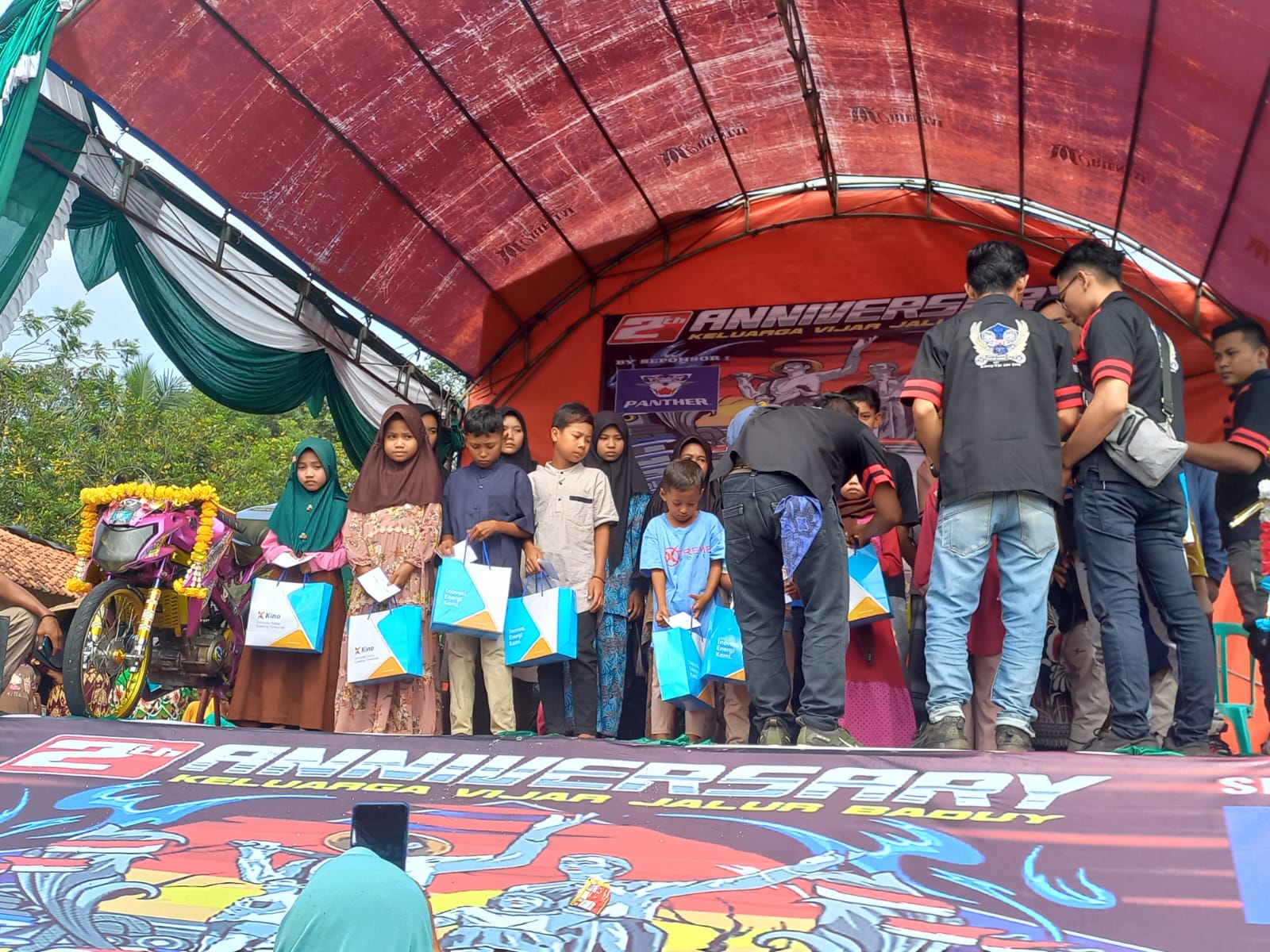 “Acara milad (kvjb) sebelum di mualai acaranya melaksanakan panjat doa dan ngaji kori diatas panggung agar acara milad yang kedua tahun ini berjalan dengn lancar dan semakin sukses dan jaya untuk (KVJB) keluarga vijar jalur baduy, acara milad ini pun mengadakan sosial sumbangan seprti sembako untuk anak-anak yatim