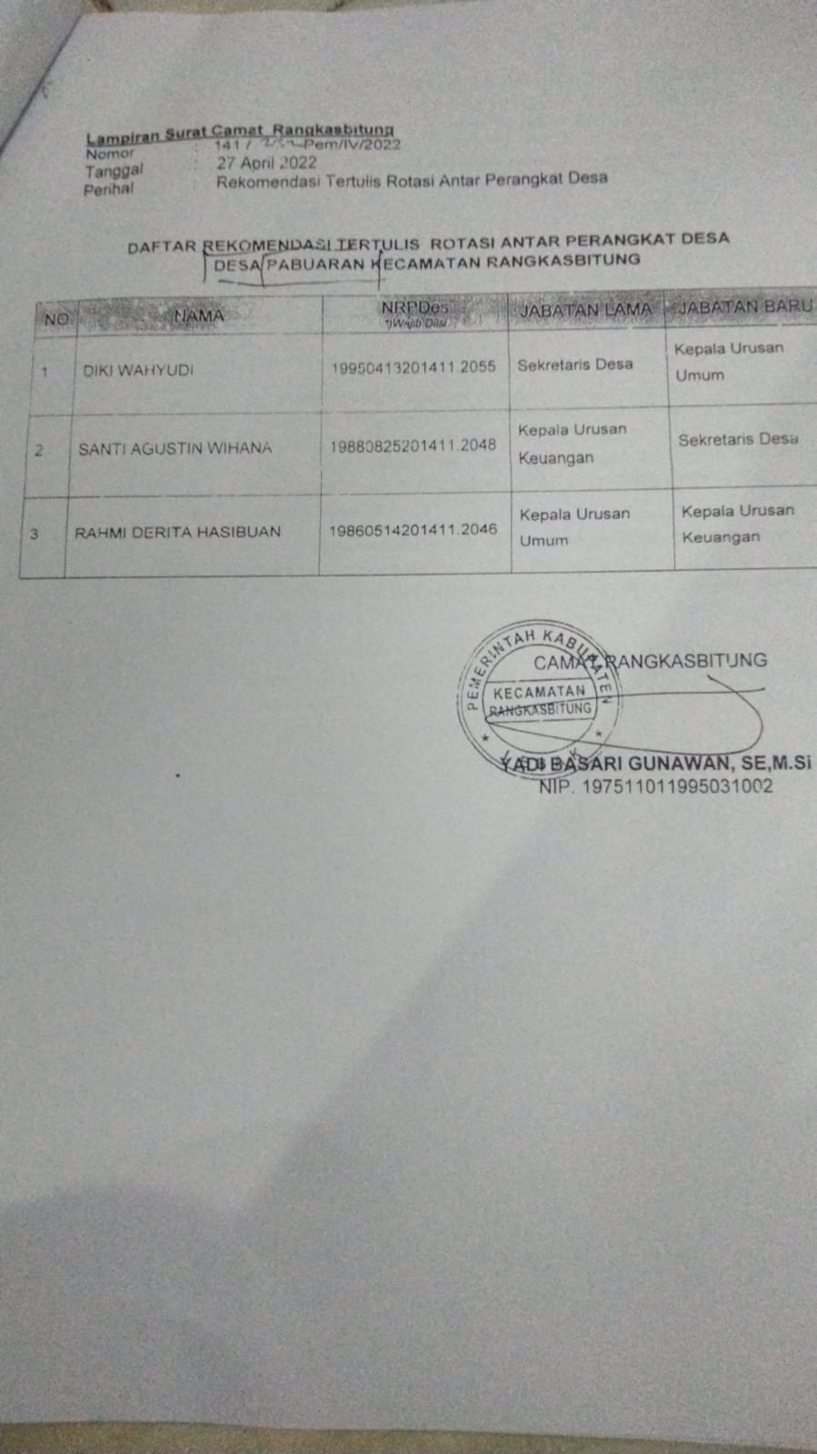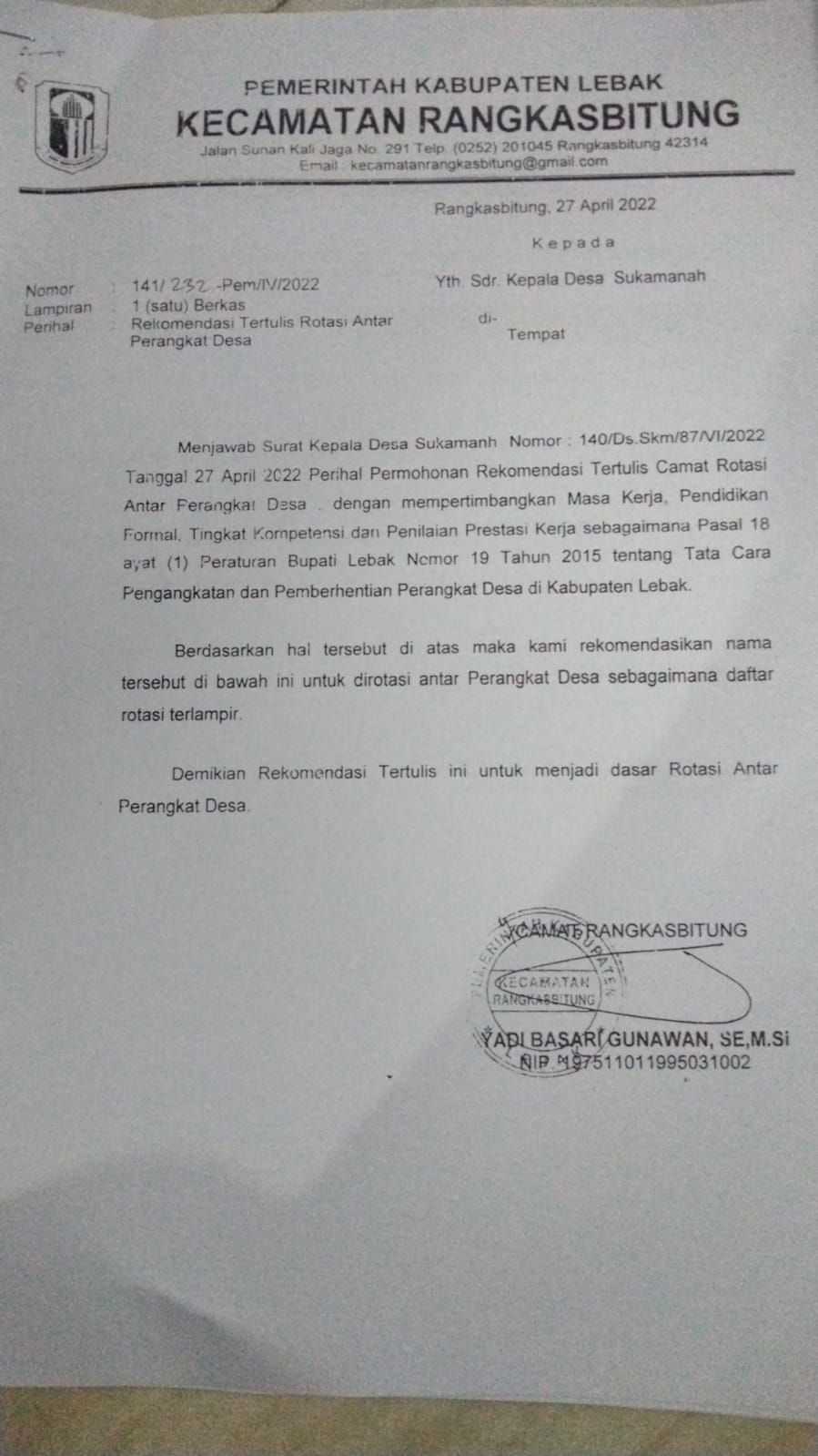 LEBAK , BANTEN | Beredarnya surat permohonan Rotasi Sekdes Sukamanah yang di sampaikan kepada Camat Rangkasbitung dan tembusan kepada BPD,hal ini di duga tidak obyektif sehingga terkesan terlalu buru, dan dugaan ada muatan politis ramai di perbincangkan di kalangan masyarakat bahkan sampai berita ini di tayangkan BPD belum menerima surat tembusan dan belum memberikan rekomendasi untuk restorasi Sekdes sukamanah.