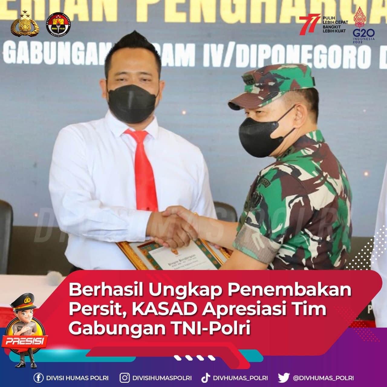 SEMARANG, JATENG | Kepala Staf Angkatan Darat (KASAD) Jenderal TNI Dr. Dudung Abdurachman, S.E., M.M., memberikan apresiasi sekaligus penghargaan atas keberhasilan tim gabungan TNI-Polri dalam mengungkap kasus penembakan terhadap istri TNI di Semarang, Jawa Tengah (Jateng).