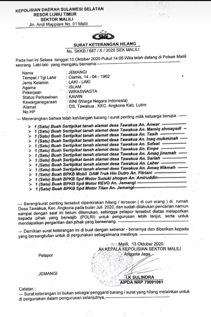 Barang/surat tersebut hilang (dicuri orang) dirumah Desa Tawakua Kecamatan Angkona, Kab. Luwu Timur pada bulan Juli 2020 dan sudah dilakukan pencarian namun sampai sekarang tidak ditemukan, sehingga pelapor tersebut diatas melaporkan kepada pihak yang berwajib (POLRI) untuk pengurusan lebih lanjut, serta untuk mendapatkan pergantian dari pihak yang berwenang.