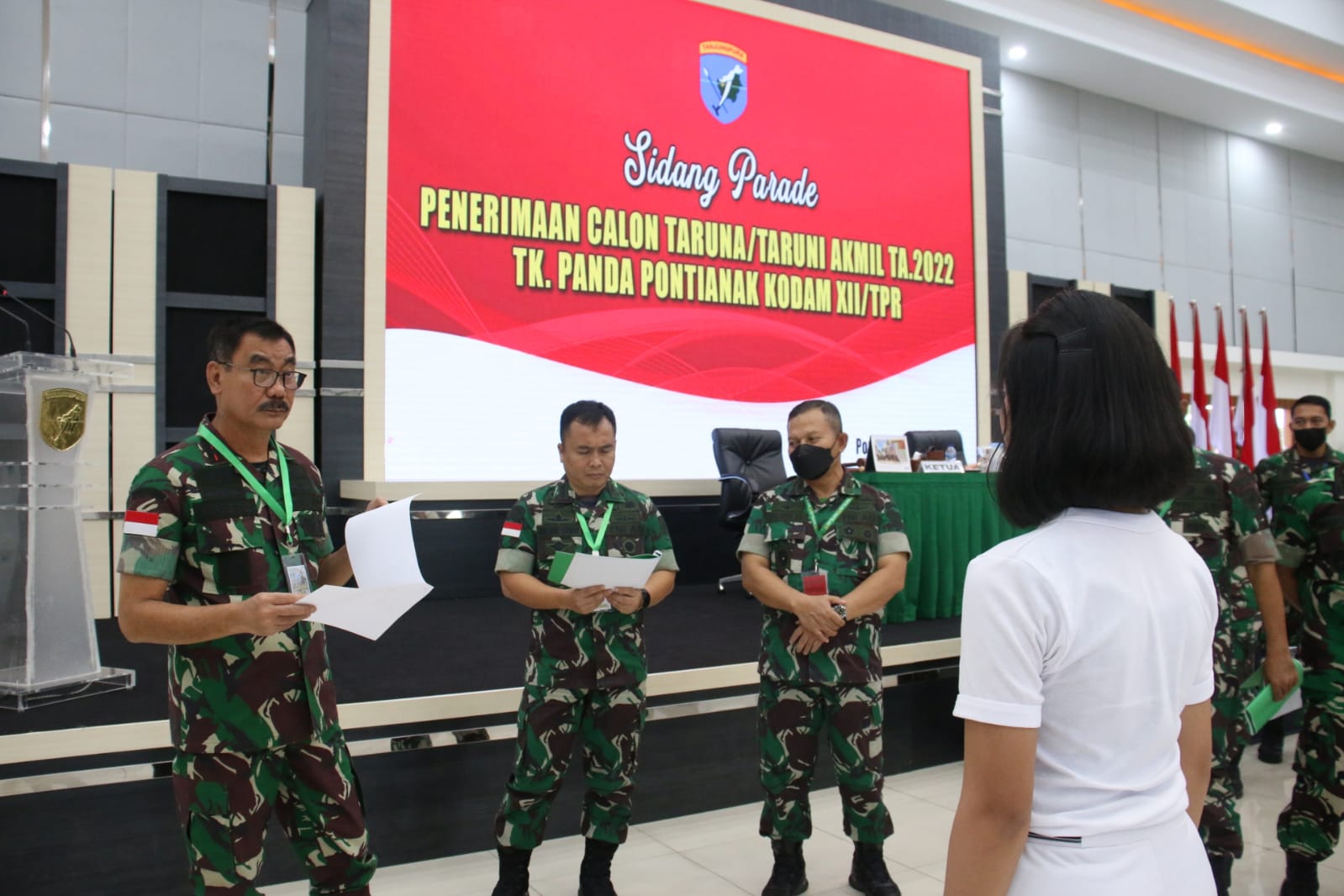 KUBU RAYA | Sidang Parade Penerimaan Calon Taruna/Taruni Akmil TA 2022 Tingkat Panda Pontianak berlangsung ketat dan transparan. Sidang Parade dilaksanakan hari ini dipimpin langsung oleh Pangdam XII/Tanjungpura, Mayjen TNI Sulaiman Agusto, S.I.P., M.M., di Aula Sudirman, Makodam XII/Tpr (26/6)