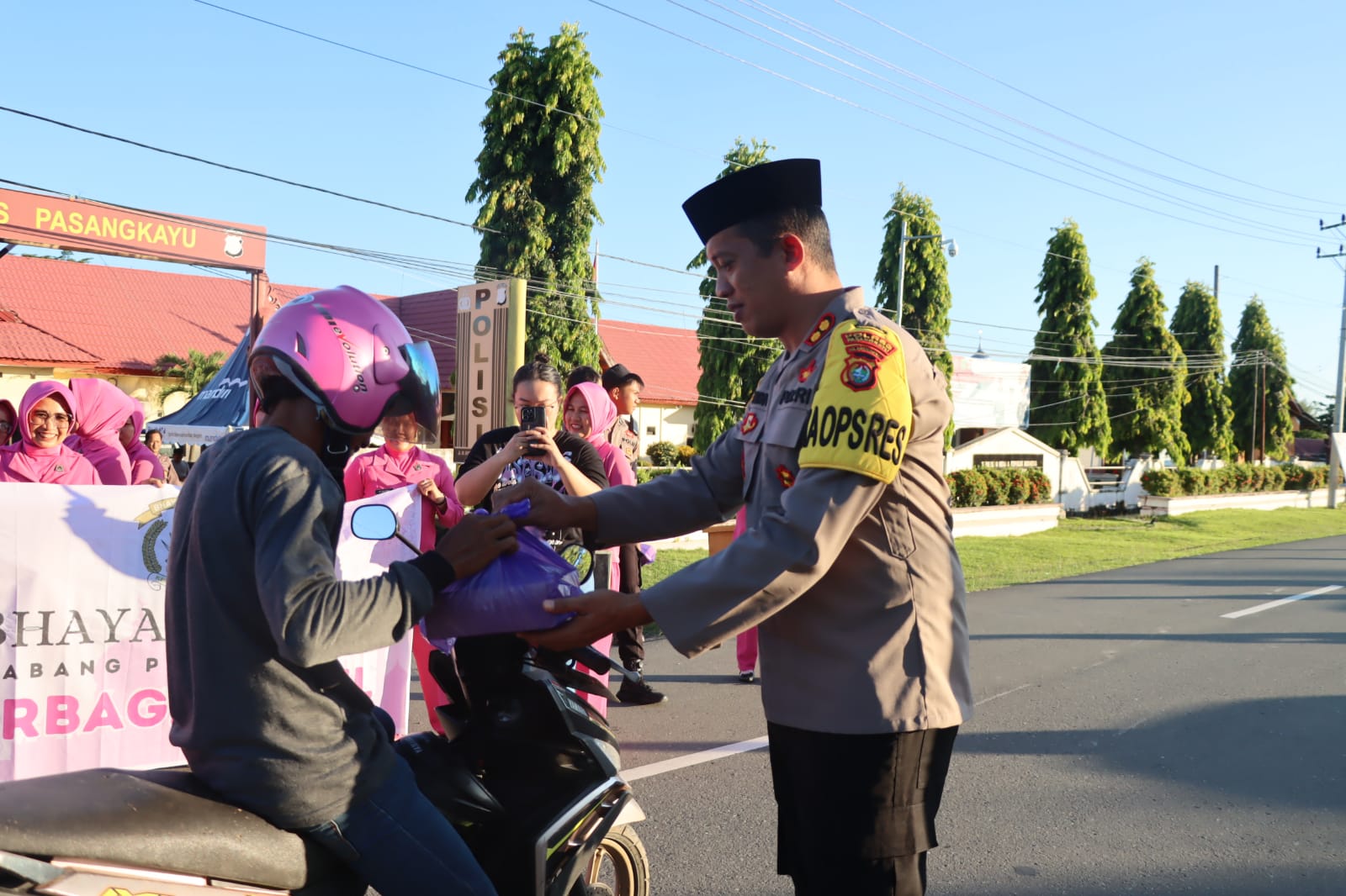 “Hari ini saya dan Ketua Bhayangkari Cabang Pasangkayu bersama anggota membagi-bagikan takjil kepada masyarakat yang melintas didepan Mako Polres Pasangkayu, Kegiatan ini juga merupakan wujud kepedulian Polres Pasangkayu terhadap sesama serta untuk meningkatkan amal ibadah saat bulan Ramadhan 1444 H di Kabupaten Pasangkayu ” ungkapnya.