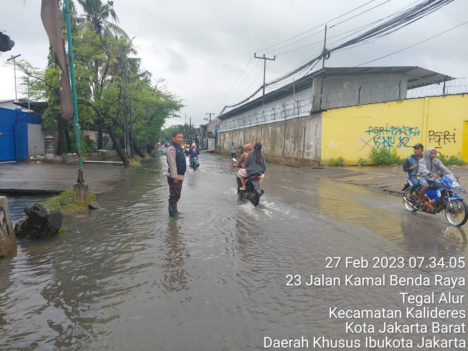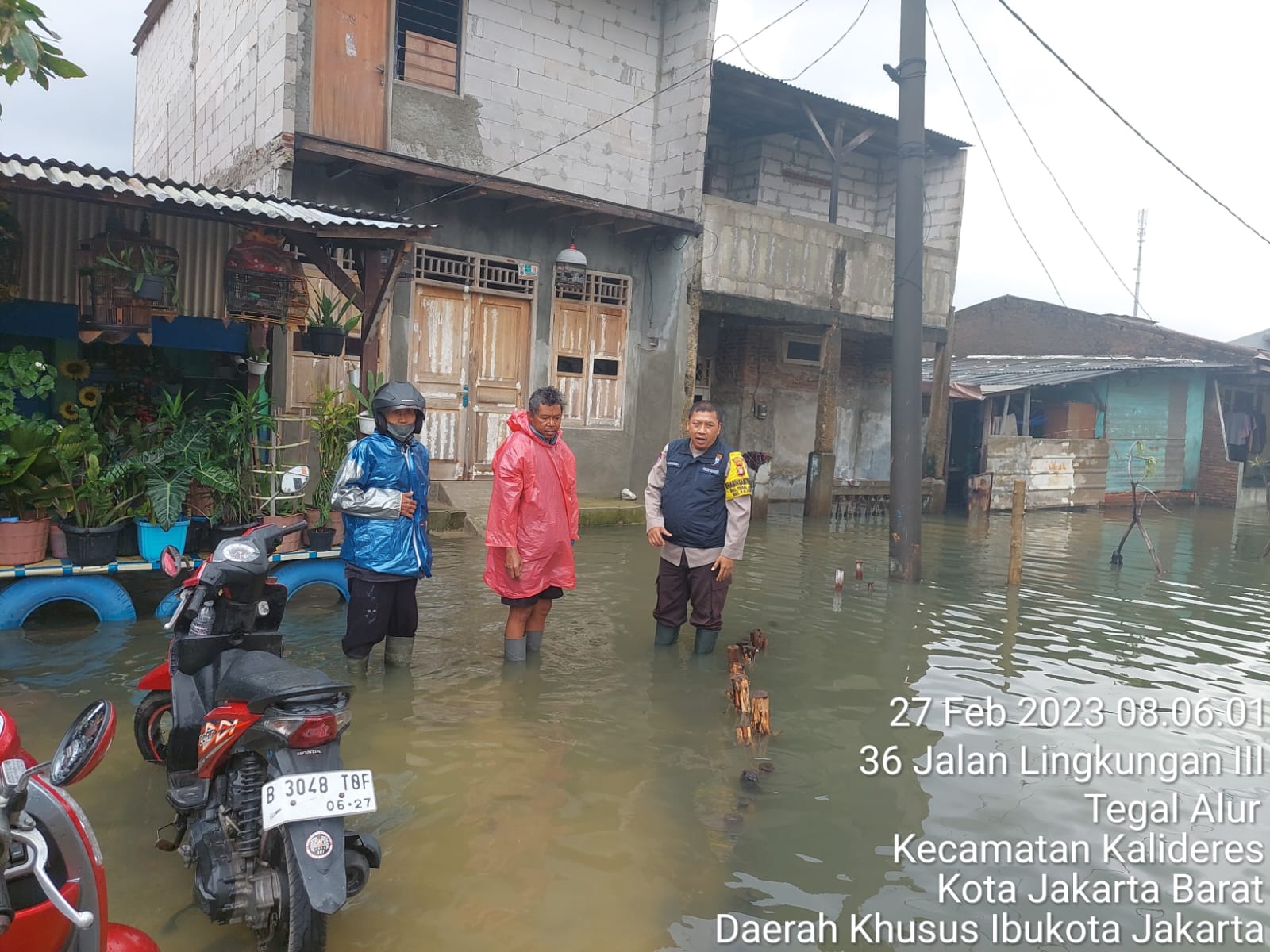 INFOINDONESIA – JAKARTA BARAT | Bhabinkamtibmas kel tegal alur Aiptu Rasaludin Anwar melaksanakan monitor pengecekan genangan air disejumlah wilayah di kelurahan tegal alur akibat curah hujan yang meningkat, Senin, 27/2/2023.