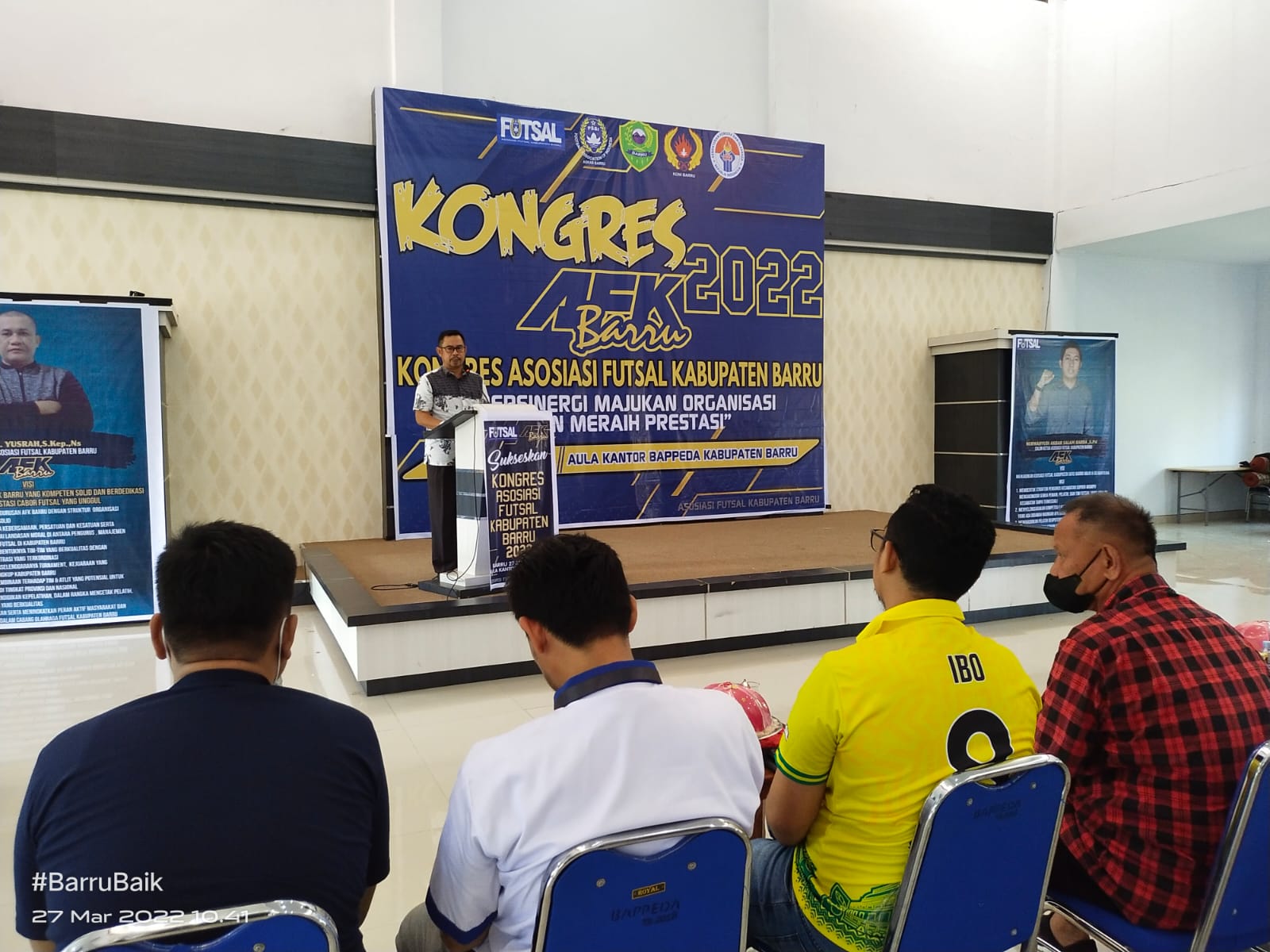 BARRU | Mewakili Bupati Barru, Asisten Adm Pembangunan Setda, Abdul Rahim, S.IP, M.Si bersama Ketua KONI Barru Abdul Muttalib Kadir hadir bersama pada pembukaan Kongres Asosiasi Futsal Kabupaten (AFK) Barru untuk suksesi peralihan Kepemimpinan Periode 2022-2026, Aula Bappeda Barru, Ahad (27/3/2022).