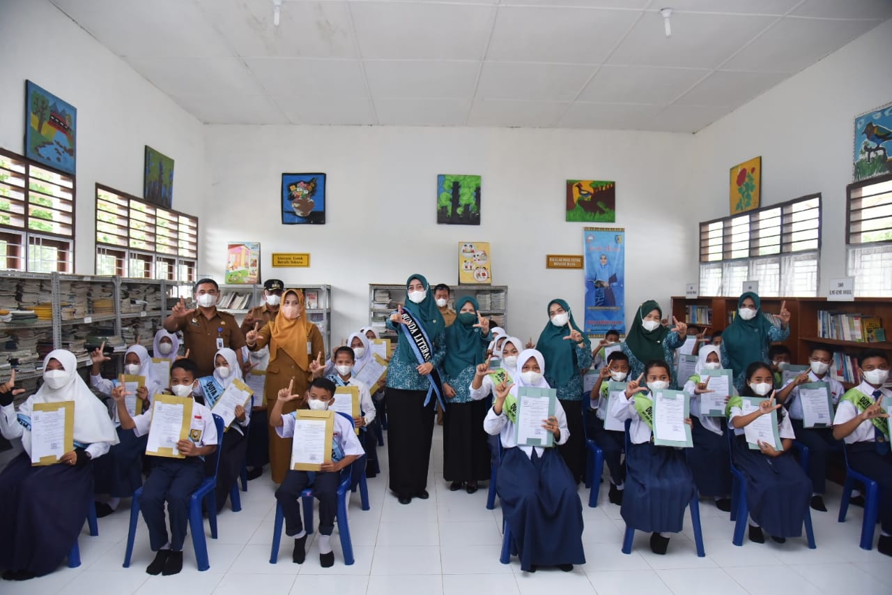 BATU BARA | Bunda Literasi Kabupaten Batu bara, Ny. Maya Indriasari Zahir bersama Dinas Perpustakaan berupaya untuk meningkatkan kesadaran pentingnya membaca dan cinta lingkungan kepada siswa/siswi Unit Pelaksana Teknis (UPT), Sekolah Menegah Pertama (SMP) Negeri 1 Datuk Lima Puluh, Kecamatan Datuk Tanah Datar, Kabupaten Batu Bara, Senin (14/02/2022).