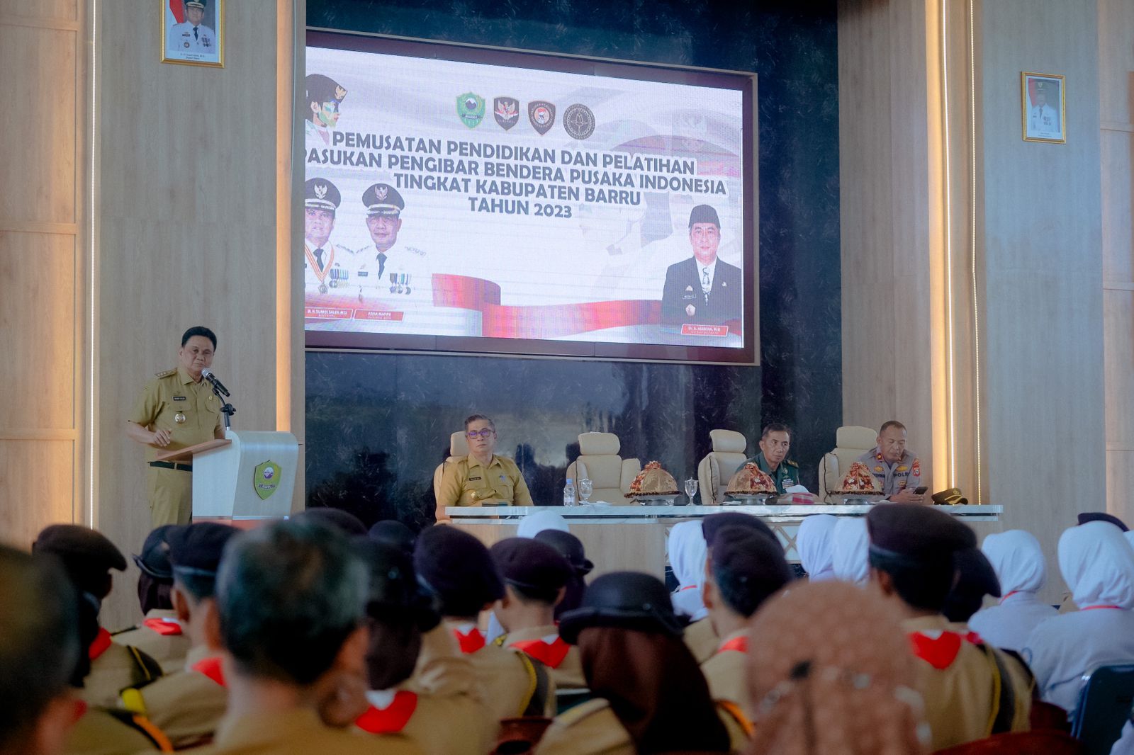 infoindonesiainews.com | BARRU – Bupati Barru Ir. H. Suardi Saleh, M.Si, menerima dan membuka secara langsung Pendidikan dan Pelatihan Pasukan Pengibar Bendera Pusaka (Paskibraka) Kabupaten Barru berlangsung di Tower MPP. Pada hari Senin, 31 Juli 2023 yang diikuti siswa/siswi terpilih dari tingkat SMA sederajat se-kabupaten Barru.