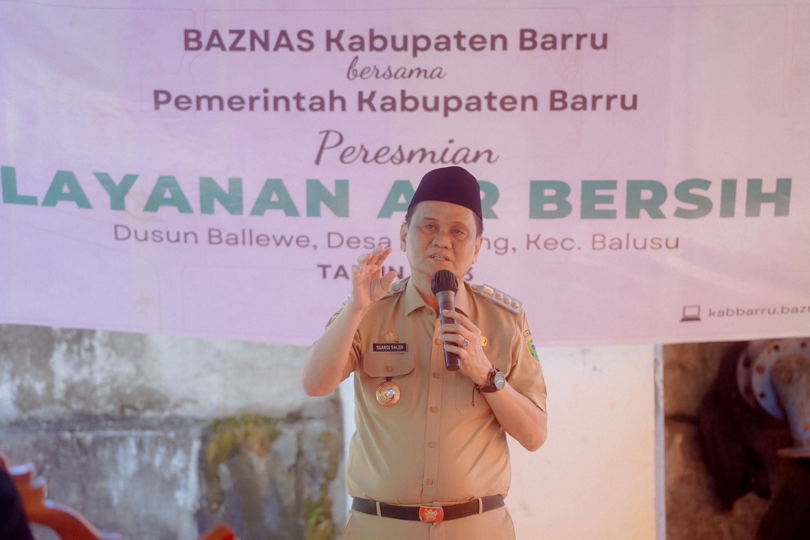 Mengawali sambutannya, Bupati Barru H. Suardi Saleh, menyampaikan terimakasih kepada Baznas yang telah membantu dan secara khusus mengapresiasi kepada Ketua Kelompok Waempubbu selaku pengelolah layanan yang punya semangat dan keteguhan hati tampa kenal lelah sehingga layanan air bersih ini bisa kembali mengalir dengan normal.