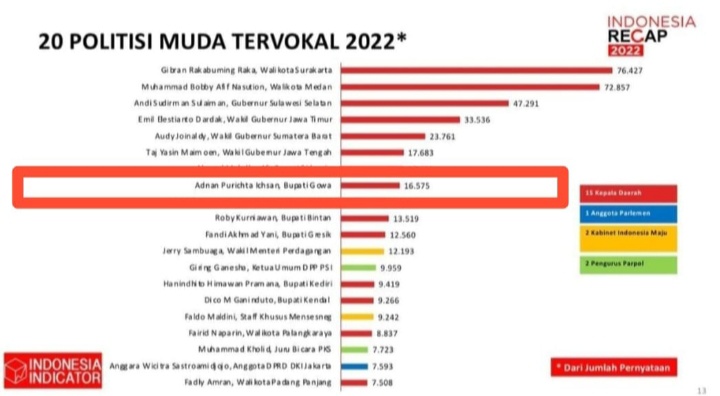 GOWA | Bupati Gowa, Adnan Purichta Ichsan masuk dalam delapan (8) politisi muda tervokal di media massa online 2022 di Indonesia versi Perusahaan Intelijen Media Indonesia Indikator (I2).
