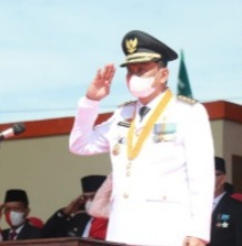 Bupati Barru, Ir. H. Suardi Saleh M.Si yang bertindak sebagai Inspektur Upacara pada Hari penuh Kehormatan ini, nampak menggunakan pakaian PDU Putih kebesarannya selaku Kepala Daerah di Lapangan Sumpang Binangae, Barru, Rabu (17/8/2022).