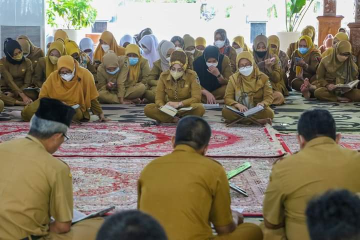 PURWAKARTA | Sebelum memulai aktivitas pada hari pertama bekerja di bulan suci Ramadhan, Bupati Kabupaten Purwakarta Anne Ratna Mustika yang kerap disapa Ambu Anne, bersama jajaran pegawai di lingkungan Pemerintah Kabupaten Purwakarta melaksanakan tadarus Al-Quran dan do’a bersama di Pendopo Purwakarta. Senin, (4/4/2022).