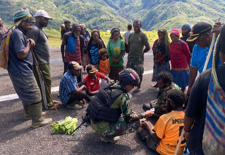infoindonesiainews.com | PEGUNUNGAN BINTANG – Satgas Pamtas Statis Yonif 310/KK lakukan Komunikasi Sosial dengan warga untuk ciptakan rasa aman di Kp. Oknanggul Distrik Kiwirok Kab. Pegunungan Bintang, Papua Pegunungan, Jumat (11/8/2023)