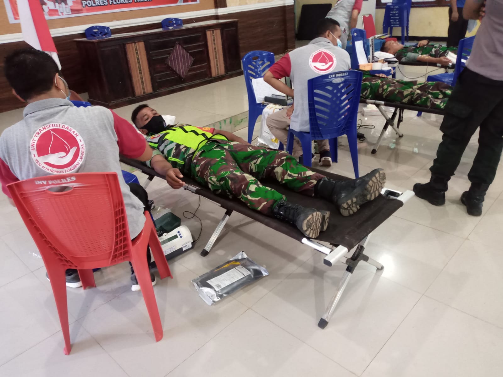 FLOTIM | Dalam rangka menyambut HUT Bhayangkara ke 76 tahun 2022, Polres Flotim Kabupaten menyelenggarakan kegiatan donor yang diikuti anggota Polres dan Kodim 1624/Flotim di Mapolres Kabupaten, Selasa(07/06/2022).