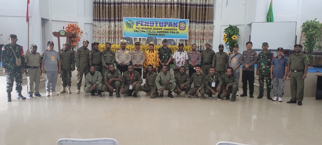KENYAM | Dalam rangka mendukung program pemerintah di bidang ketertiban dan keamanan, Dandim 1715/Yahukimo Letkol Inf Johanis Victorianus Tethool menghadiri serta menutup pelatihan dasar anggota Satuan Polisi Pamong Praja (Satpol PP) Kabupaten Nduga di Gedung Pertemuan Kegayam, Distrik Kenyam, Kabupaten Nduga, Provinsi Papua Pegunungan, Kamis (25/8)