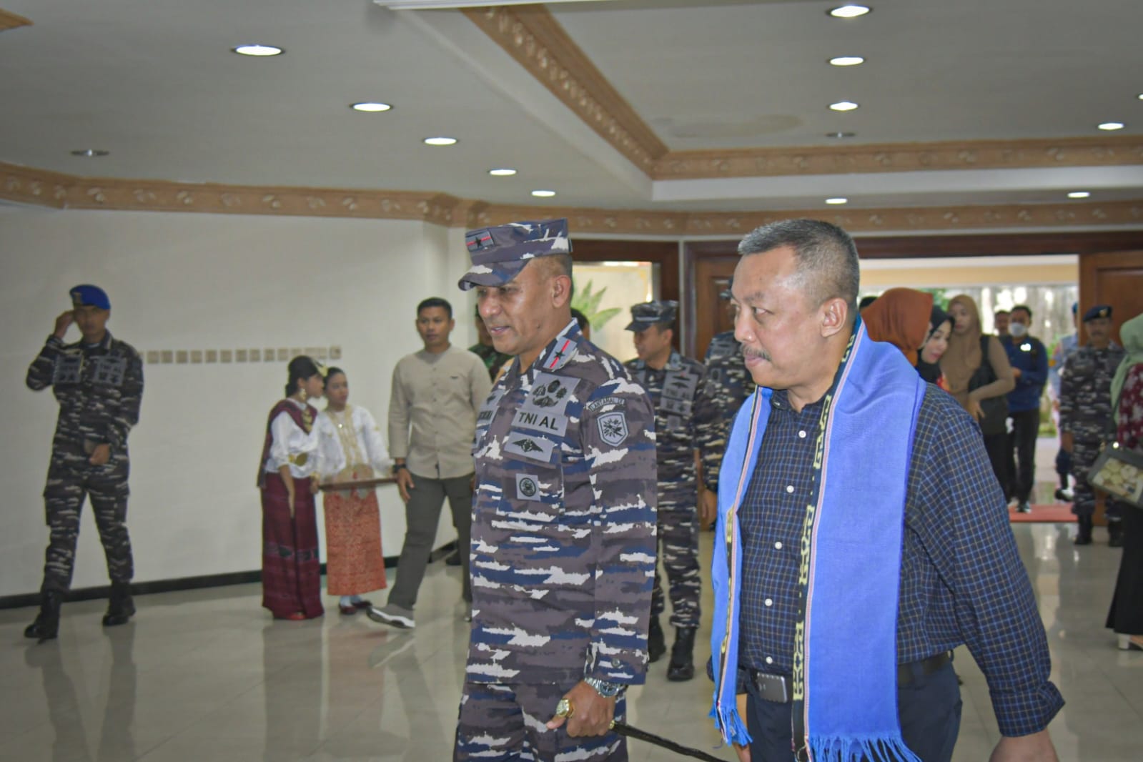 Rombongan Deputi Gubernur Bank Indonesia dan Wakil Asisten Operasi Kepala Staf Angkatan Laut tiba di Ambon disambut oleh Danlantamal IX beserta Pejabat Utama Lantamal IX dan Kepala Kantor Perwakilan Bank Indonesia Provinsi Maluku beserta staf di VIP Room Pemda Provinsi Maluku Bandara Pattimura, Ambon dengan iringan Tari Lenso dan pengalungan kain tenun.