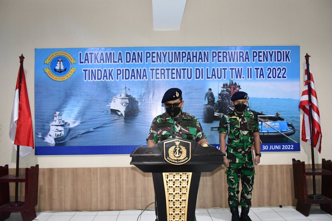 MAKASSAR | Pangkalan Utama TNI AL VI (Lantamal VI) Makassar menggelar Latihan Keamanan Laut (Latkamla) dan Penyumpahan Perwira Penyidik Tindak Pidana Tertentu (Tipiter) di Laut TW II TA. 2022 di jajaran Lantamal VI.