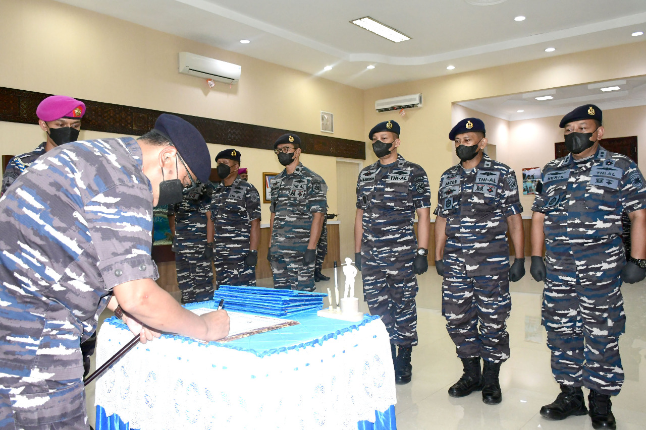 MAKASSAR | Komandan Lantamal VI (Danlantamal VI ) Makassar Laksamana Pertama TNI Dr. Benny Sukandari, S.E., M.M., CHRMP, pimpin pelaksanaan Serah Terima Jabatan (Sertijab), pengukuhan dan penyerahan jabatan jajaran internal Lantamal VI. Acara berlangsung di ruang Kajaolalido Markas Komando (Mako) Lantamal VI, Jum’at (08/04/2022).