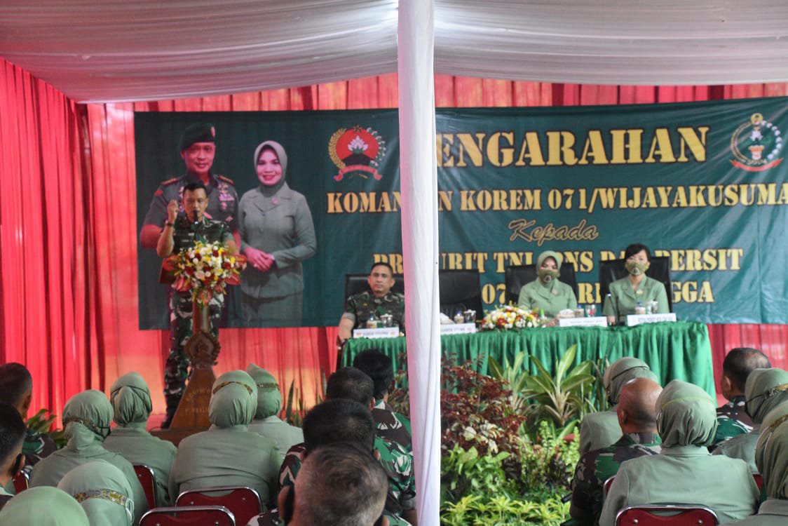 Danrem 071/Wijayakusuma Kolonel Inf Yudha Airlangga, S.E., dengan didampingi Ketua Persit Kartika Chandra Kirana Koorcab Rem 071 PD IV/Diponegoro Ny. Natania Yudha Airlangga, mengawali pengarahannya mengatakan agar segenap prajurit untuk terus bersyukur atas apa yang diberikan Tuhan Yang Maha Esa, karena para prajurit sudah berada ditengah-tengah keluarga melaksanakan tugas didaerahnya sendiri. “Karenanya, sebagai prajurit teritorial harus bisa membawa dan merangkul masyarakatnya untuk hidup berdampingan. Baik-baiklah dengan rakyat atau masyarakat, karena rakyat atau masyarakat adalah senjata paling ampuh untuk pertahanan negara”, ujarnya.