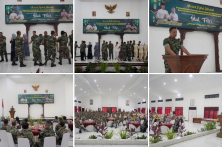 BANYUMAS | Danrem 071/Wijayakusuma Kolonel Inf Yudha Airlangga, S.E., dengan didampingi Ketua Persit Kartika Chandra Kirana Koorcab Rem 071 PD IV/Diponegoro Ny. Natania Yudha Airlangga berhalal bihalal bersama segenap keluarga besar Korem 071/Wijayakusuma di Gedung Pertemuan A Yani Makorem 071/Wijayakusuma, Sokaraja, Banyumas. Jumat (5/5/2023).