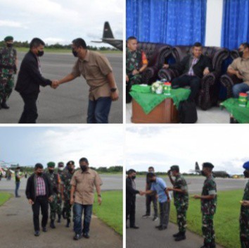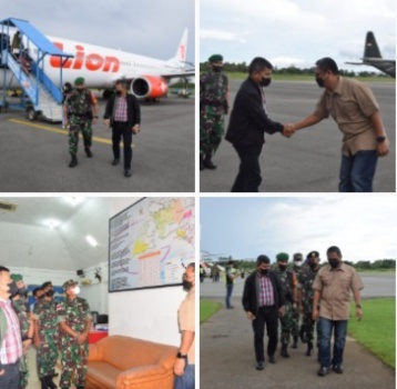 Merauke | Tiba di Bandar Udara Mopah Merauke Sabtu (26/03/2022) Pukul 16.15 WIT, Pangdam I/ Bukit Barisan Mayjen TNI Achmad Daniel Chardian, S.E., M.Si., beserta rombongan disambut oleh Dansatgas Pamtas RI-PNG Yonif 123/RW Letkol Inf Goklas P. Silaban bersama Danrem 174/ATW TNI E. Reza Pahlevi,S.E selaku Komandan Komando Pelaksana Operasi (Dankolakops) Korem 174, para Kepala Seksi Korem 174/ATW, Dandenpom XVII/3 Merauke.l, Dandim 1707/Merauke, serta Danyonif Rider 755/Yalet.