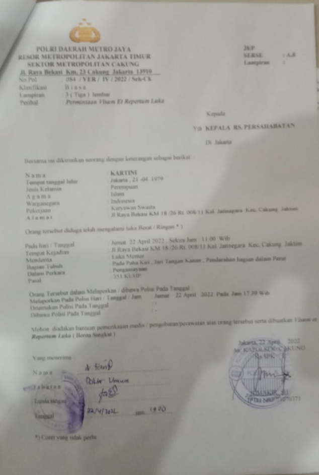 JAKARTA | Diduga akibat tindak kekerasan yang dilakukan oknum petugas parkir Rumah Sakit (RS) Swasta dibilangan Cakung, Jakarta Timur, Ka (43) seorang wartawati sebuah perusahaan Media harus rela kehilangan janin dalam kandungannya. Sabtu, 23 April 2022.