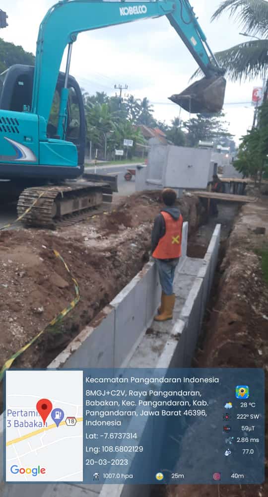 INFOINDONESIA – PANGANDARAN|Pada beberapa hari yang lalu, proyek galian saluran di sepanjang jalan raya kabupaten Pangandaran yang tepat nya di daerah Desa Babakan kecamatan Pangandaran, yang mana galian saluran air tersebut di kerjakan oleh PT Moderen.