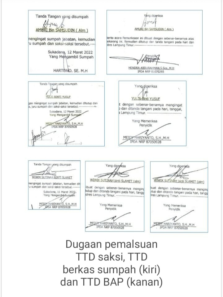 Dari pengamatan wartawan atas tanda tangan di BAP dan berkas sumpah para saksi, ahli, dan tersangka, yang diperlihatkan PH Wilson Lalengke ke awak media, terlihat jelas perbedaan tanda tangan mereka di kedua berkas tersebut. “Kita sudah lihat dan cermati, termasuk menanyakan kepada rekan kita yang anggota polisi juga, bahwa tanda tangannya hampir pasti dipalsukan. Tiga saksi yang tanda tangannya berbeda antara di BAP dengan di berkas sumpah adalah saksi korban pemilik papan bunga Yulis binti Yusuf dan Wiwik Sutinah binti Slamet, serta saksi Amuri bin Samsudin,” beber advokat Daniel Minggu lagi.