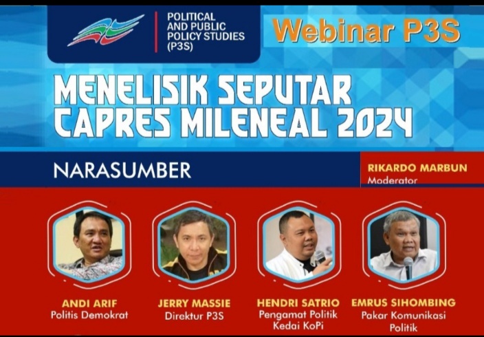 JAKARTA | Menelisik Potensi Pemimpin Muda Milenial Tampil di Pilpres 2024,sebuah tajuk webinar yang diselenggarakan oleh Political and Publik Policy Studies (P3S) dengan moderator Rikardo Marbun, diisi narasumber Direktur P3S, DR Jerry Massie, Ph.D dan Pakar Komunikasi Politik DR Emrus Sihombing Rabu (25/5/2020).