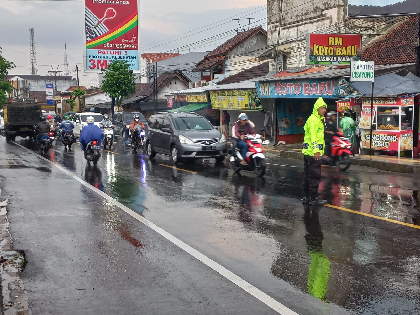 Cuaca hujan tidak membuat personil Polsek Cisayong Polres Tasikmalaya Kota tak surut dalam melaksanakan strong point melaksanakan Pengaturan lalu lintas.