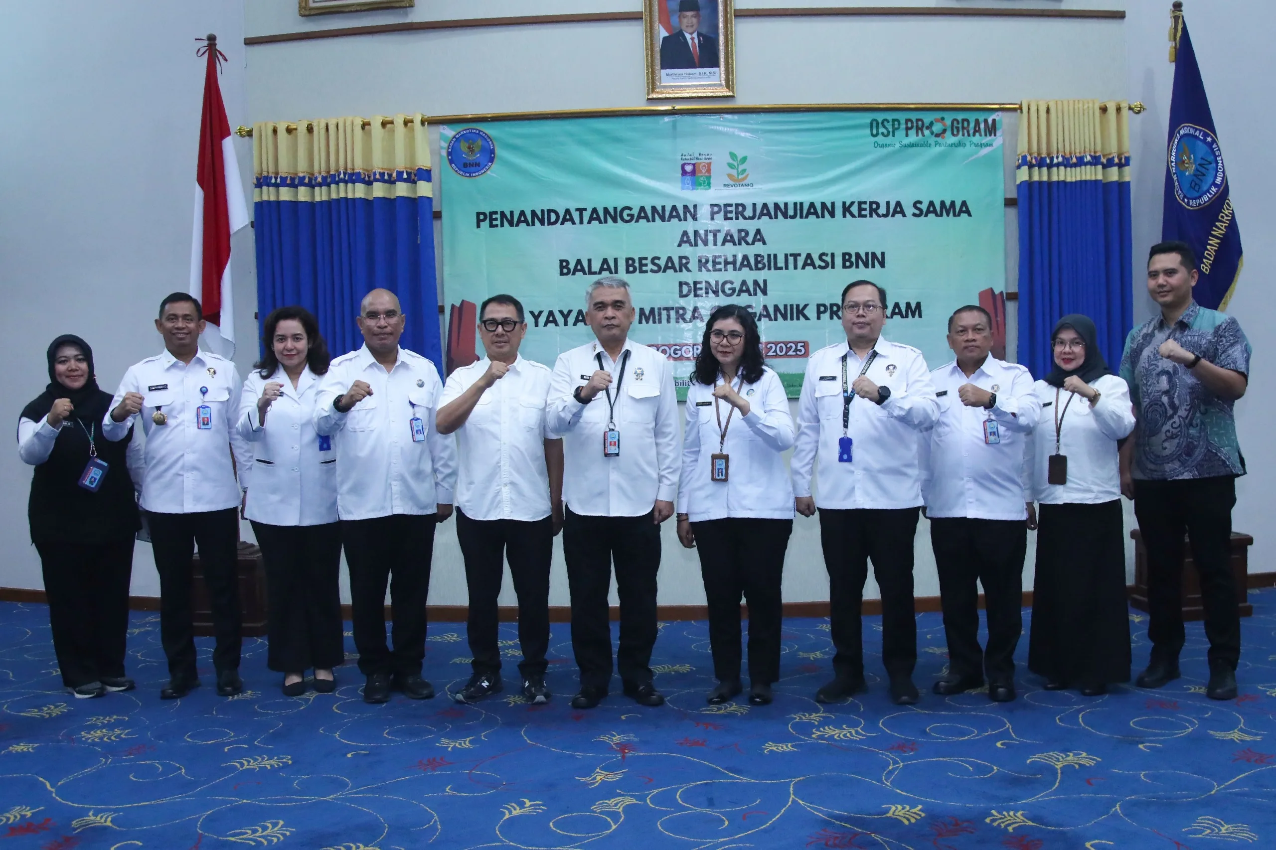 BOGOR, JABAR – Langkah strategis diambil Badan Narkotika Nasional (BNN) dalam memperkuat program pascarehabilitasi melalui kerja sama dengan Yayasan Mitra Organik Program. Disaksikan langsung oleh Deputi Bidang Hukum dan Kerja Sama BNN RI, Agus Irianto, penandatanganan perjanjian kerja sama dilakukan oleh Kepala Balai Besar Rehabilitasi BNN, dr. Elvina Katerin Sahusilawane, dan Ketua Yayasan Mitra Organik Program, John Tumiwa, di Balai Besar Rehabilitasi BNN, Lido, Bogor, Jawa Barat, Senin (21/7).