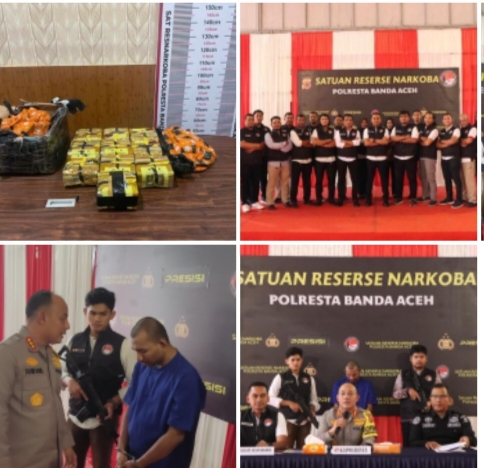 Kapolresta Banda Aceh KBP. Fahmi Irwan Ramli dalam konfrensi pers memaparkan terkait penemuan barang bukti narkotika jenis sabu sebanyak 10,4 (sepuluh koma empat) Kilogram di Bandara Internasional Sultan Iskandar Muda, dan penerbitan DPO terhadap tersangka Eryandi, Kamis (23/11/2023).