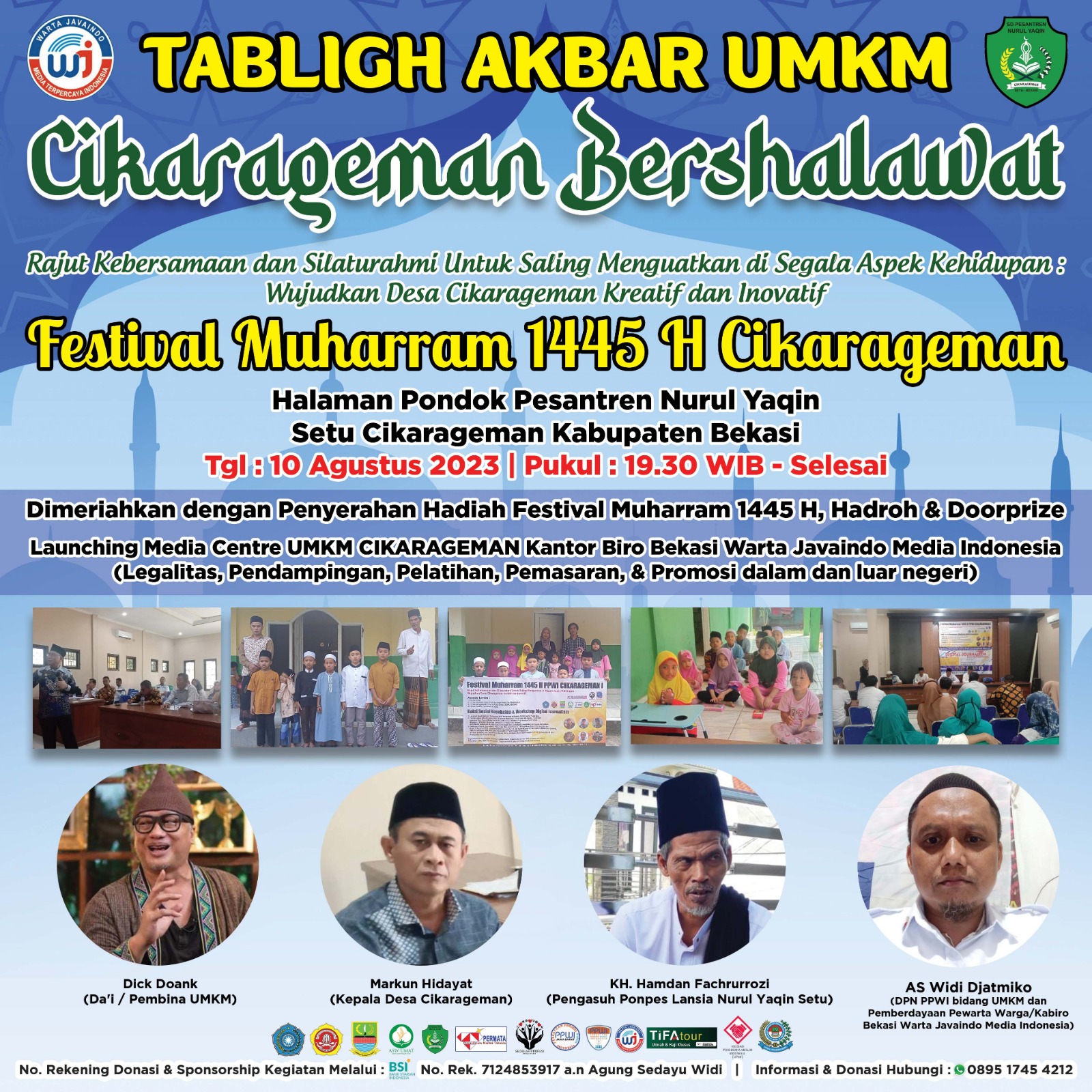 Tabligh Akbar UMKM Gema Sholawat Desa Cikarageman ini digelar di halaman Pondok Pesantren Nurul Yaqin Setu Kabupaten Bekasi pada Kamis (10/8) di buka oleh Pak Kades Cikarageman, Markun Hidayat sekaligus menutup Festival Muharram perdana PPWI Cikarageman di hadapan ratusan jamaah.