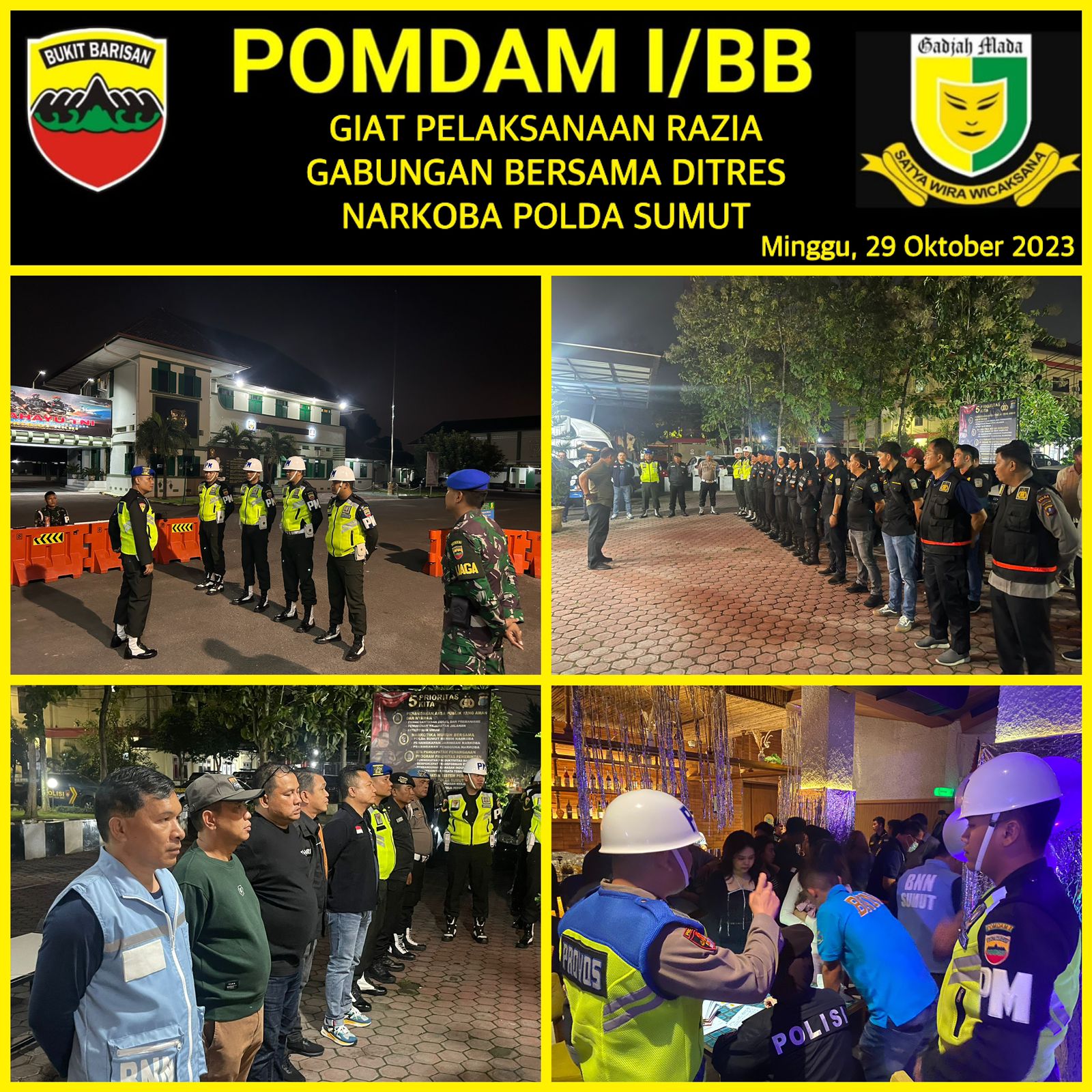 MEDAN, SUMUT | Sekira Pukul 23.30 Wib Personel Pomdam I/BB dengan menggunakan kendaraan Patwal Dinas sedan vios, dengan Noreg 5030-I, melaksanakan kegiatan Razia Gabungan Pomdam I/BB dengan Ditreskrim Narkoba Polda Sumut di tempat hiburan Malam (THM) Kota Medan. Sabtu,( 28/10/2023).