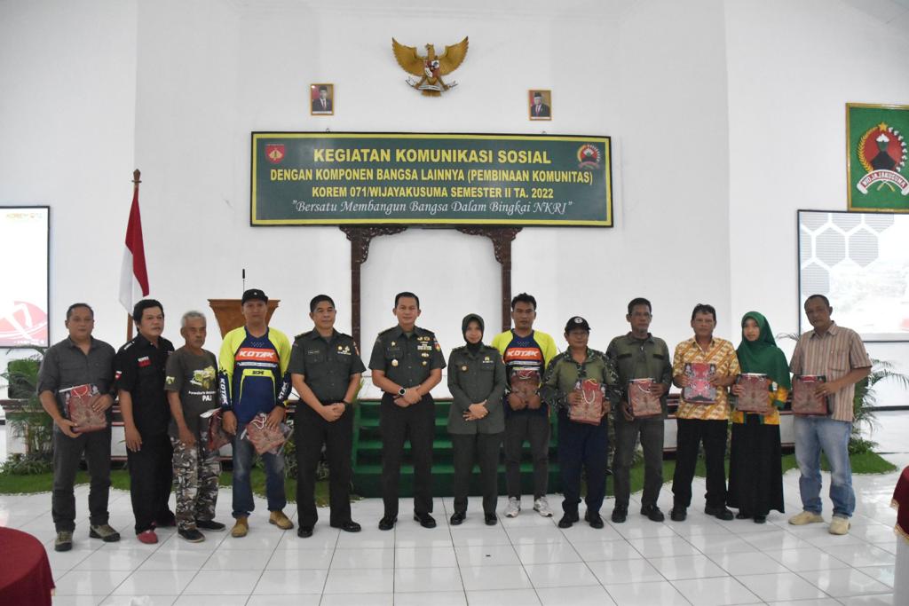 Komunikasi Sosial yang dikemas dalam kegiatan Pembinaan Komunikasi Komunitas ini bertajuk “Bersatu membangun bangsa dalam bingkai NKRI”, diikuti Komunitas Purwokerto American Jeep (PAJ), Komunitas Mitra Jaga Wana Banyumas, Komunitas Treal Kemangkon (KOTAK) Kemangkon Purbalingga, Komunitas Mitra Bina Wijaya Cilacap, Komunitas Pembatik Banjarnegara, untuk meningkatkan kebersamaan dan mempererat hubungan TNI khususnya Korem 071/Wijayakusuma dengan seluruh komponen bangsa lainnya di wilayah Korem 071/Wijayakusuma.