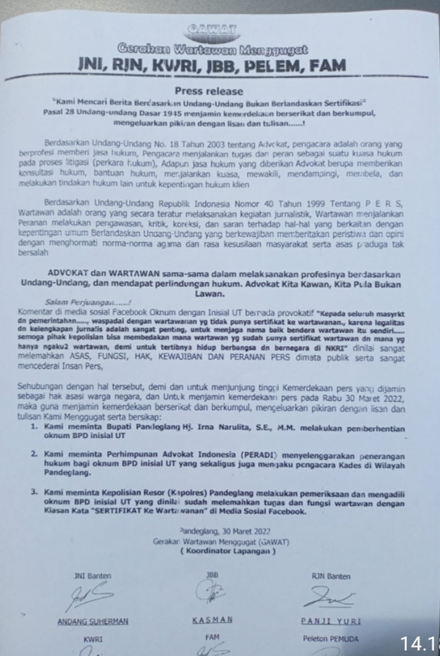 Pers meminta Perhimpunan Advokat Indonesia (PERADI) menyelenggarakan penerangan hukum bagi oknum BPD tersebut yang sekaligus juga mengaku pengacara bagi Kades di Derah Pandeglang. Pers meminta Kepolisian Resor (Polres) Pandeglang melakukan pemeriksaan dan mengadili oknum BPD yang dimaksud, yang dinilai sudah melemahkan tugas dan fungsi wartawan dengan kiasan kata “SERTIFIKAT Kewartawanan” di Media Sosial Facebook.