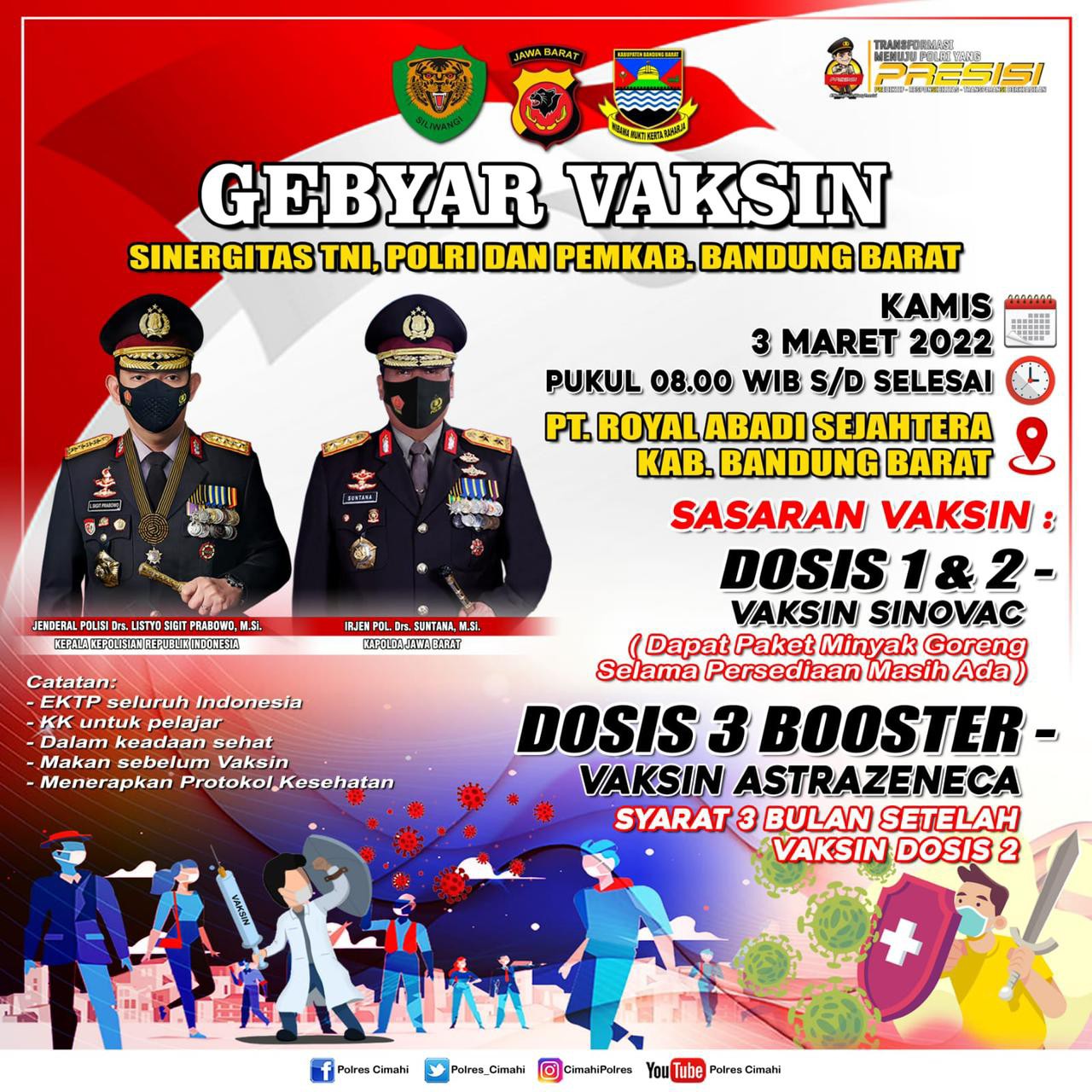 BANDUNG BARAT, JABAR | Polda Jabar dan Polres Cimahi pada hari ini memastikan vaksin Booster yang digelar oleh Pt Royal Abadi Sejahtera di Bandung Barat, Jabar , akan mulai diberikan pada hari ini, Kamis (3/3/2022). Seluruh Masyarakat umumnya, khususnya bagi Karyawan yang dihimbau untuk mengikuti vaksinasi booster dosis 1 dan 2 juga 3,bertujuan untuk melindungi diri dari Covid-19, terutama varian Omicron.
