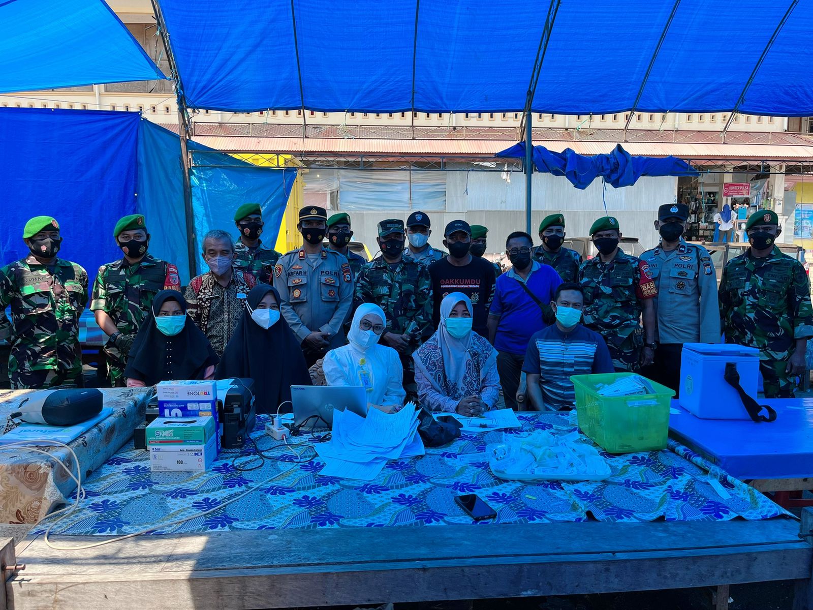 BARRU | TNI-Polri bekerjasama Puskesmas Pekkae menggelar kegiatan vaksinasi Covid-19, tahap 1, 2 dan 3, di pelataran Pasar Pekkae, Kelurahan Lalolang, Kecamatan Tanete Rilau, Kabupaten Barru, Jumat pagi (8/4/2022).