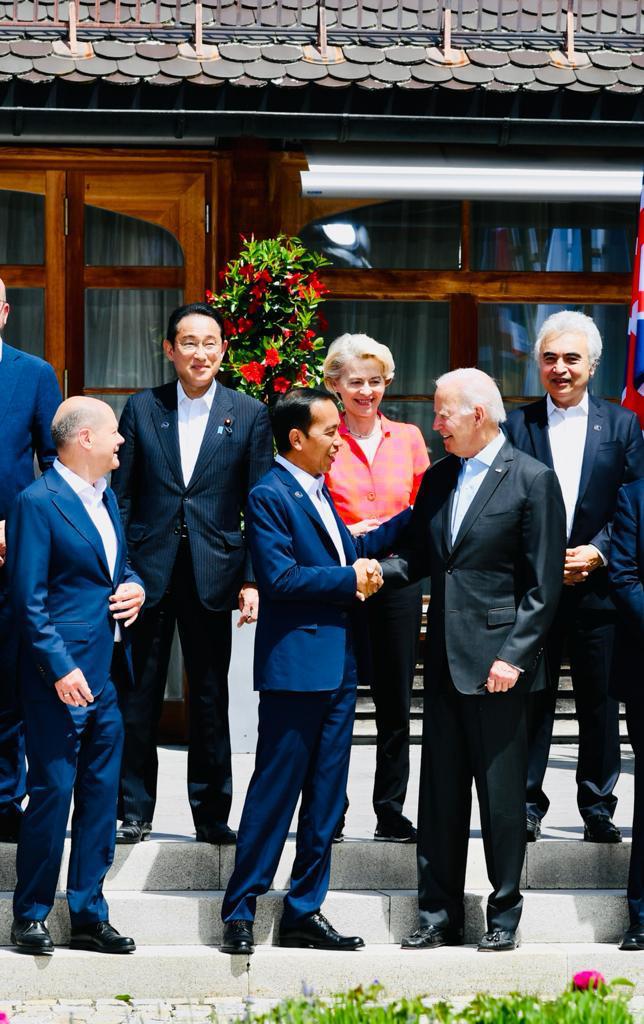Presiden Jokowi selanjutnya melakukan sesi foto bersama, nampak Kepala Negara berdiri di antara Perdana Menteri Jerman Olaf Scholz dan Presiden Amerika Serikat Joe Biden. Berikutnya, Presiden melakukan sesi pertemuan G7 yang terdiri dari dua sesi.