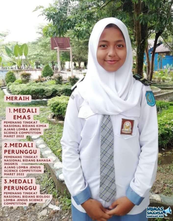ACEH | Dian Afifah yang akrab dipanggil Dian adalah salah Seorang siswa SMAN 1 Simpang Kiri, kota Subulussalam yang berhasil mengharumkan nama Kota Subulussalam dengan meraih medali Emas pada ipen Kompetisi Sain tingkat Nasional Bidang Kimia kategori Ajang Lomba Jenius Seciece Competition pada Bulan Maret ini, Sabtu (27/3/2022).