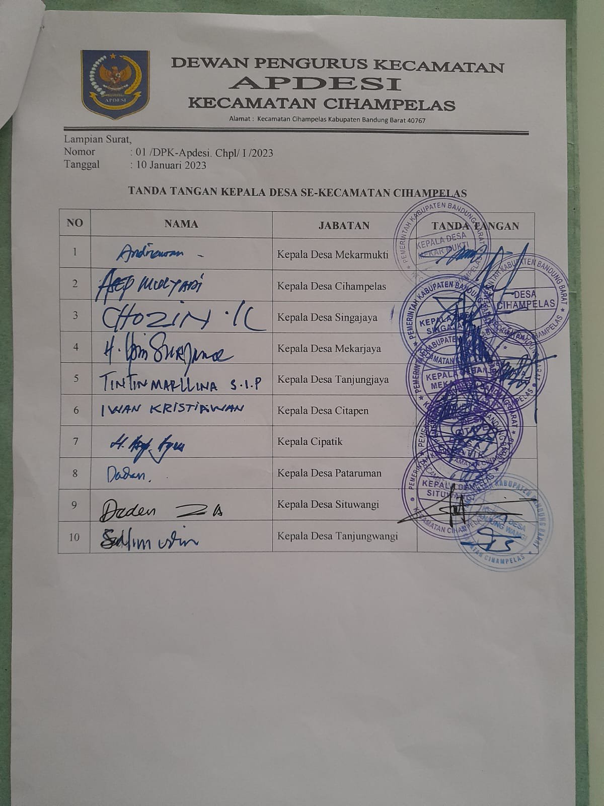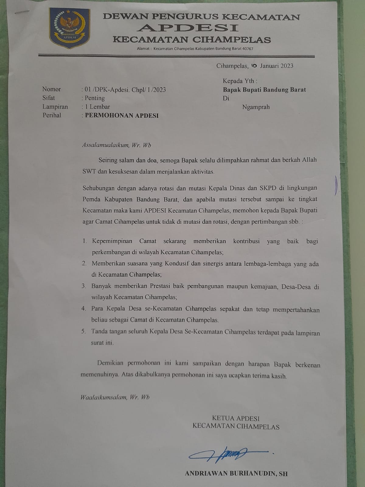 CIHAMPELAS, BANDUNG BARAT-JAWA BARAT | Dewan pengurus Kecamatan Asosiasi Perangkat Desa Seluruh Indonesia (APDESI) Kecamatan Cihampelas, Kabupaten Bandung Barat, Andriawan, akhirnya menyetujui hasil musyawarah untuk malayangkan surat pernyataan sikap kepada Bupati Bandung Barat Hengky Kurniawan terkait hasil dari Rotasi Mutasi para Camat di Kab. Bandung Barat. Selasa, (10/01/2023).