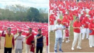 BARRU | Ribuan Warga dengan seragam merah putih melakukan Senam Massal Gelora Merah Putih dalam rangkaian menyemarakkan Hari Ulang Tahun Kemerdekaan Republik Indonesia, ke 77 Lapangan Sumpang Binangae Kab. Barru, Ahad (14/8/2022).