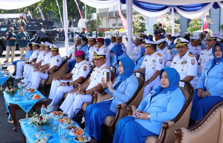 TNI AL, LANTAMAL VI | Komandan Pangkalan Utama TNI AL VI (Danlantamal VI) Brigjen TNI (Mar) Amir Kasman, S.E., M.M., dan Ketua Korcab VI Daerah Jalasenastri Armada II (DJA II) Ny. Dewi Amir Kasman menghadiri Upacara Peringatan HUT Amada RI Tahun 2022 bertempat di Dermaga Madura Ujung Surabaya, Senin (05/12/2022).