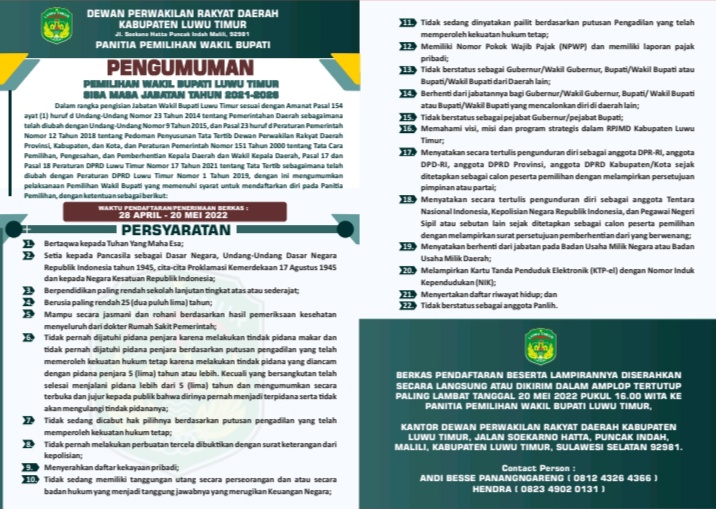 LUWU TIMUR | Akhirnya hari ini DPRD Luwu Timur melalui panitia pemilihan Wakil Bupati Luwu Timur membuka pendaftaran Wakil Bupati, hal ini tertera dalam pengumuman yang dibuat oleh DPRD Luwu Timur,pada hari Kamis (7/4/22).